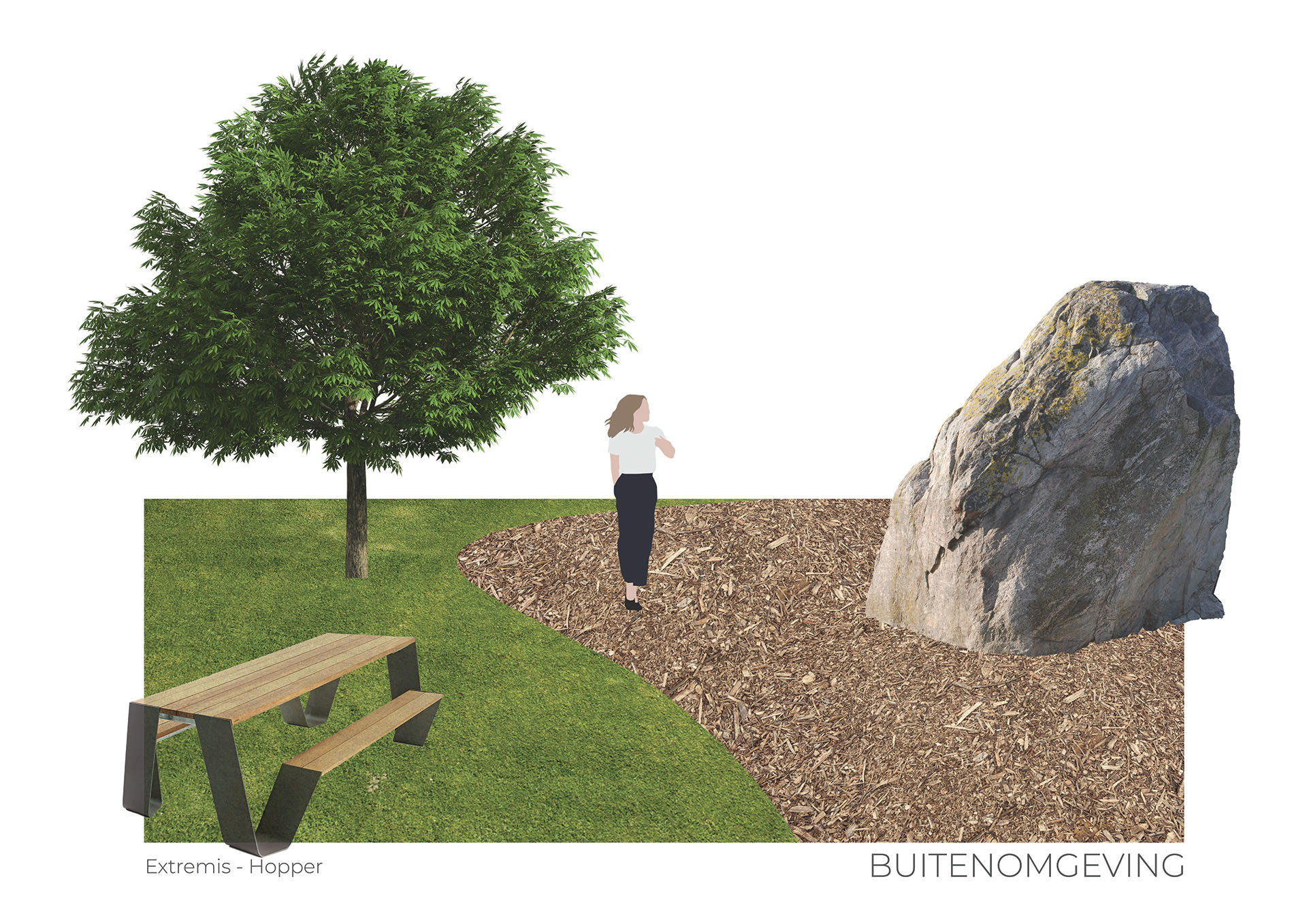 Buiten wordt er gewerkt met natuurlijke boulderblokken zonder grepen. Hierdoor word je beter voorbereid wanneer je ‘vrij’ gaat klimmen. De vloer bestaat uit kunstgras en houtschilfers als valdemping. Wanneer je de blokken buiten wil gebruiken is het de bedoeling dat je een valmat huurt of koopt om incidenten te voorkomen. Boulderen is een fascinerende sport om naar te kijken, daarom heb ik gekozen om picknicktafel van extremis buiten voorzien. Deze bestaat namelijk in een halve versie waardoor je kan kijken naar de klimmers.