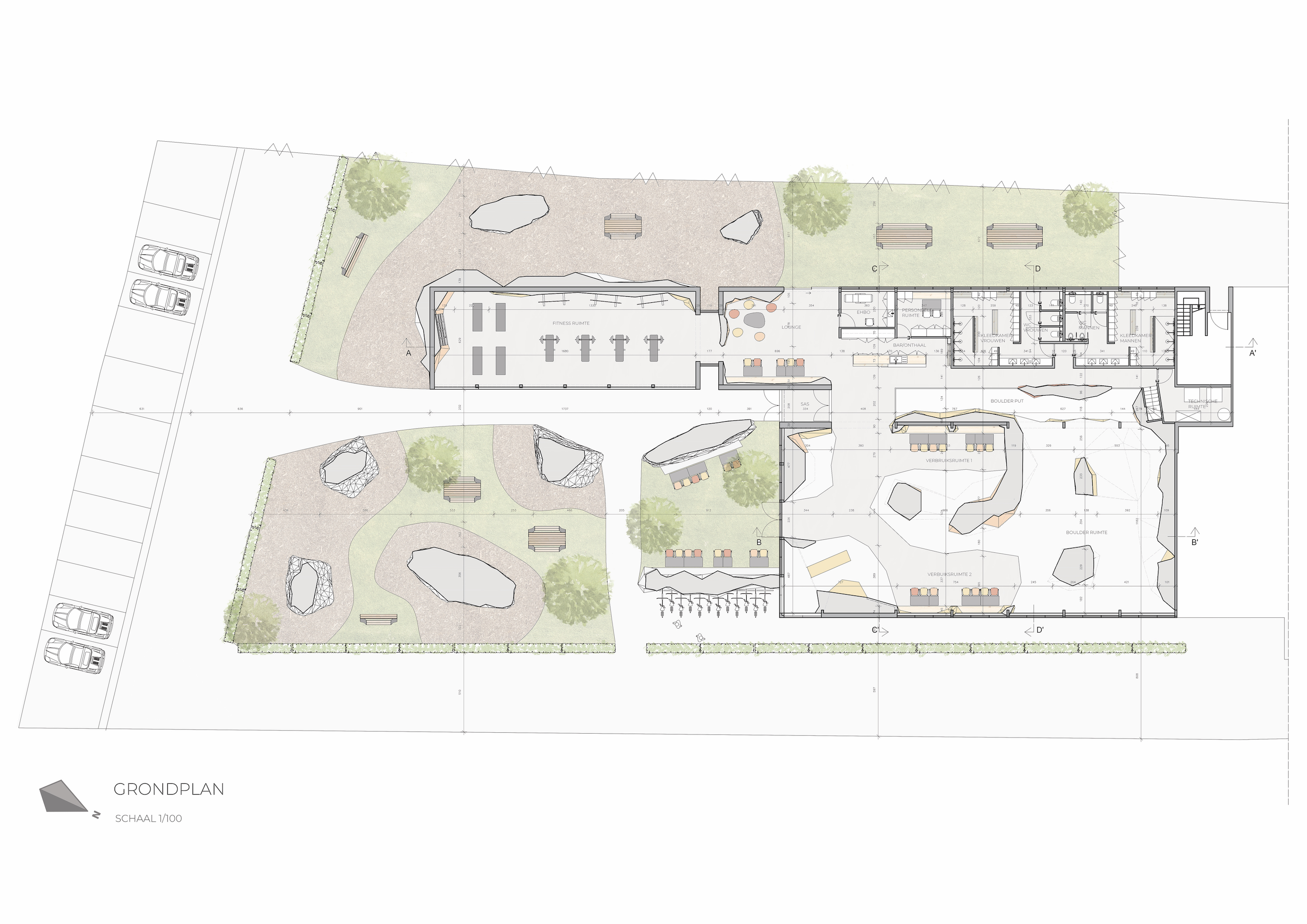 Om het pand toe te treden is er een toegangsweg voorzien die vertrekt vanaf de straat. Vanuit deze toegangsweg kome je voorbij de klimzaal en krijg je een eerste zicht op deze sport. Je wandelt door het boulder buiten park naar de toegang van het pand.