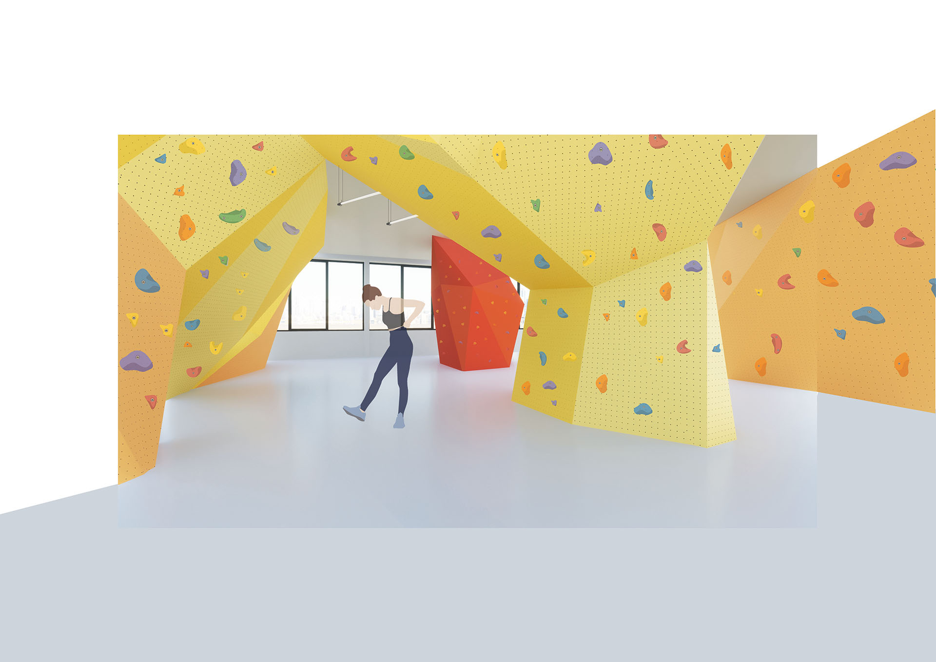 De fitnessruimte is verbonden met deze lounge. Deze wordt gebruikt door klimmers om hun spieren te trainen in functie van het klimmen. Deze kan ook gebruikt worden als opwarmruimte.