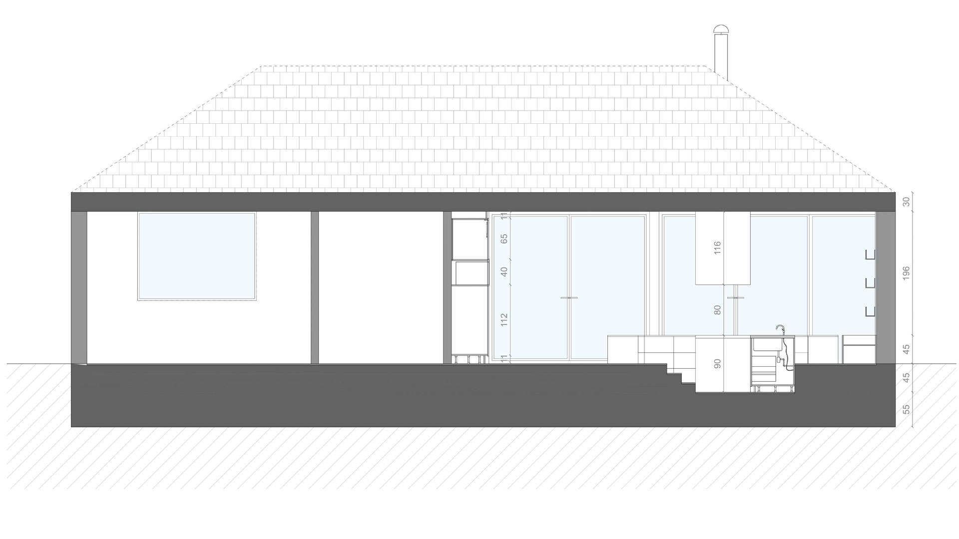Vooraan in het pand wordt er gewerkt met licht groene beton. Deze kleur komt terug in de de keuken zodat deze één groot geheel vormt met de tuin en de voortuin. Door te werken met grote glaspartijen, die de mogelijkheid bieden om volledig open te gaan, kan men gemakkelijk van de ene ruimte naar de andere ruimte doorlopen.
