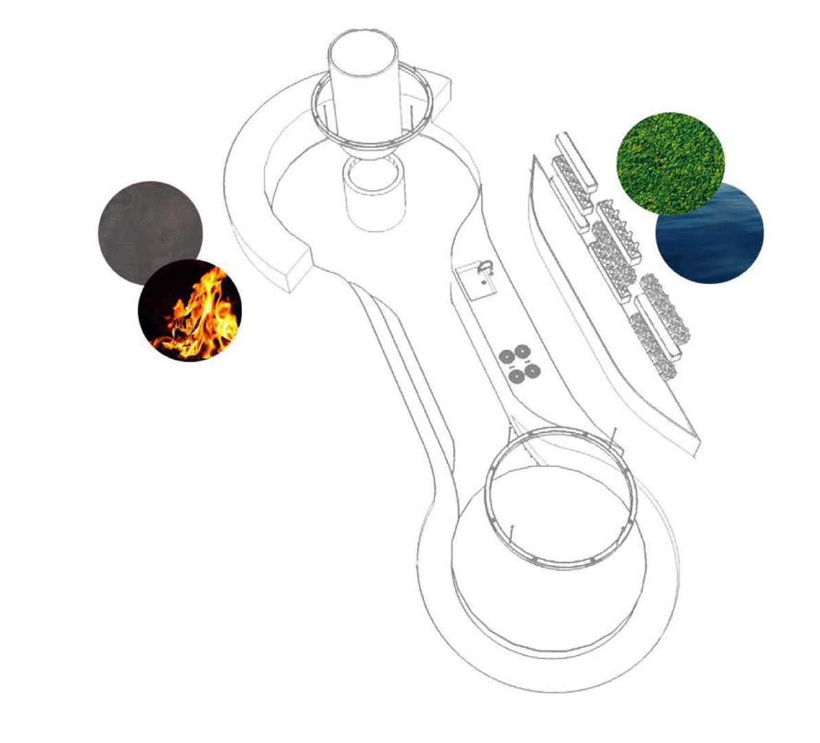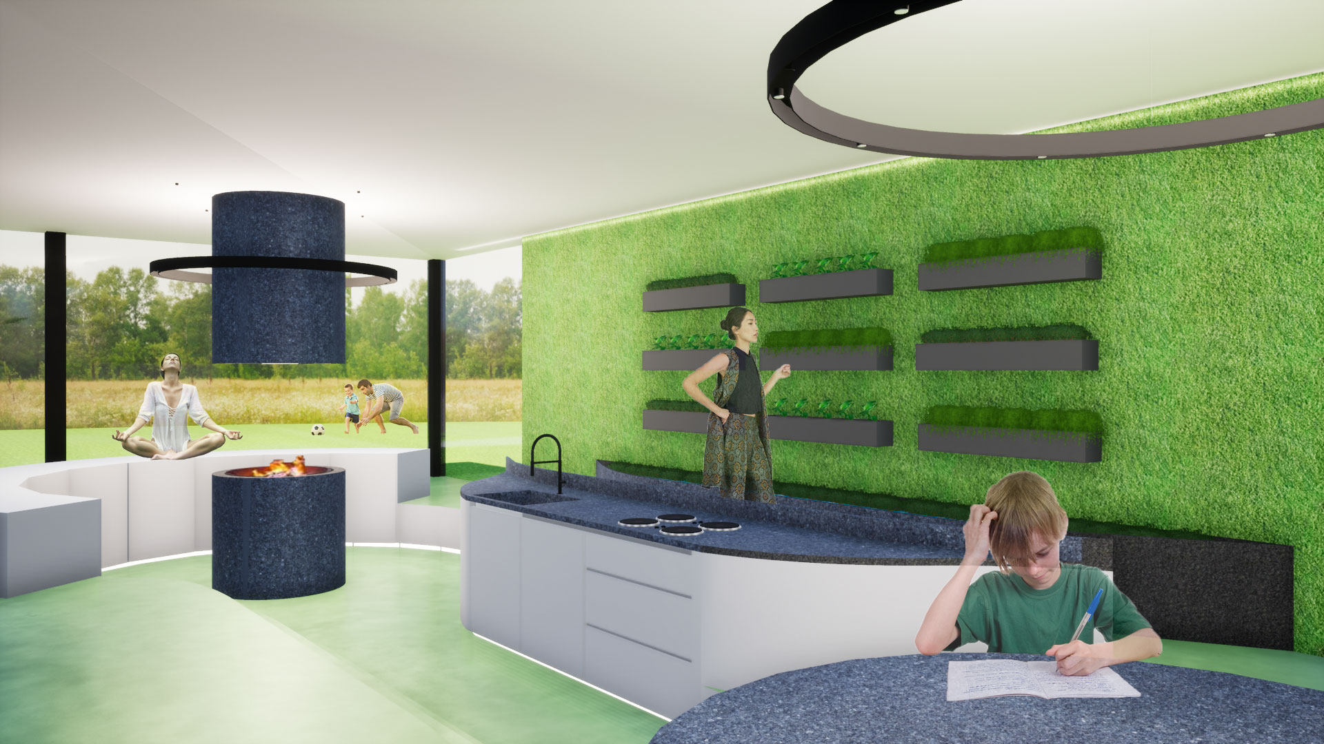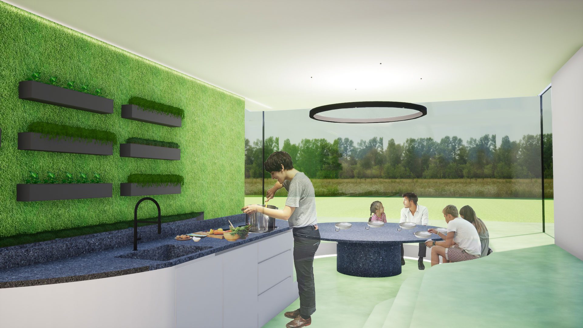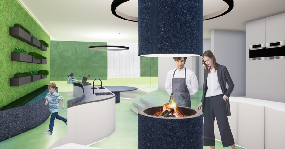 Organische vormen komen voor in de natuur. Daarom hadden we het idee te gaan werken met 2 grote cirkels die met elkaar verbonden zijn. In de ene cirkel kan men eten en het eten voorbereiden, in de andere koken op de rand aan het vuur. Doordat de architect wou weten waar alles vandaan komt, hebben we een plantentuin binnenin voorzien. Hierbij kan hij gemakkelijk zijn kruiden vers plukken om te gebruiken bij het koken.