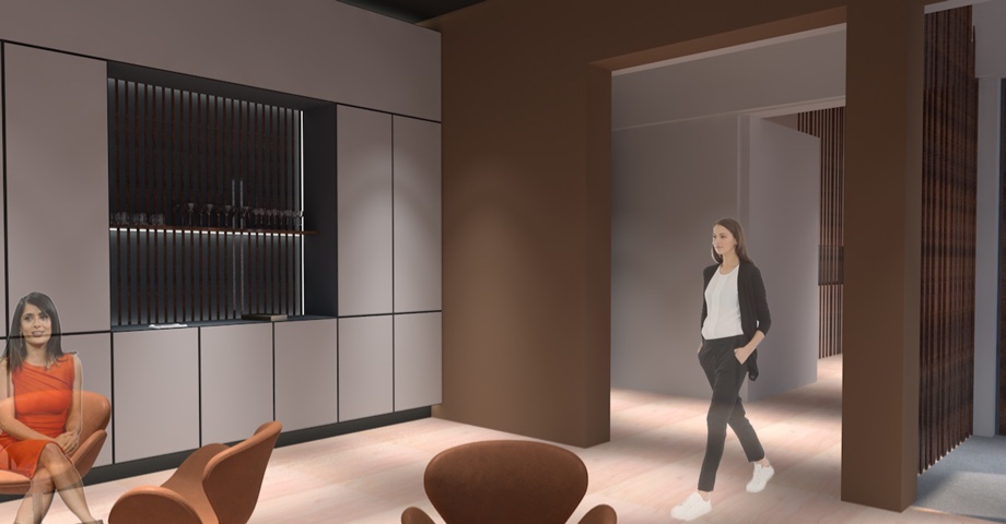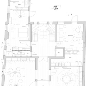 Wanneer je binnenkomt heb je een onthaalruimte/bar. Hier kan men ontvangen worden door de gastheer/dame en tot rust komen. De ruimte ernaast is multifunctioneel. Ze kan gebruikt worden zowel voor recepties als voor vergaderingen. Deze ruimte is verbonden met keuken. Indien gebruikt als vergaderruimte kan de doorgang naar de keuken afgesloten worden.