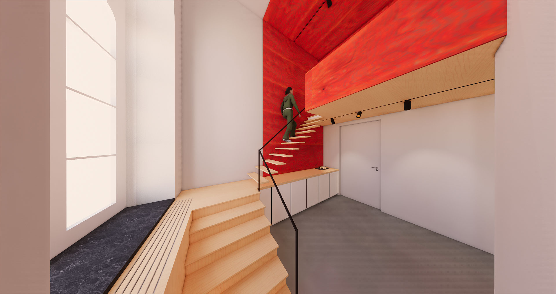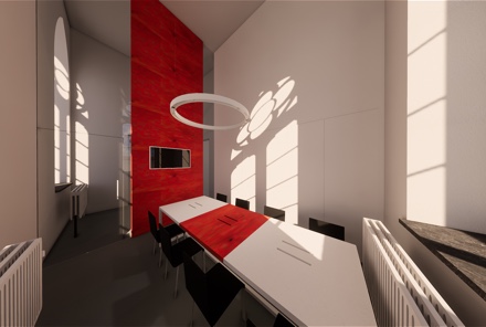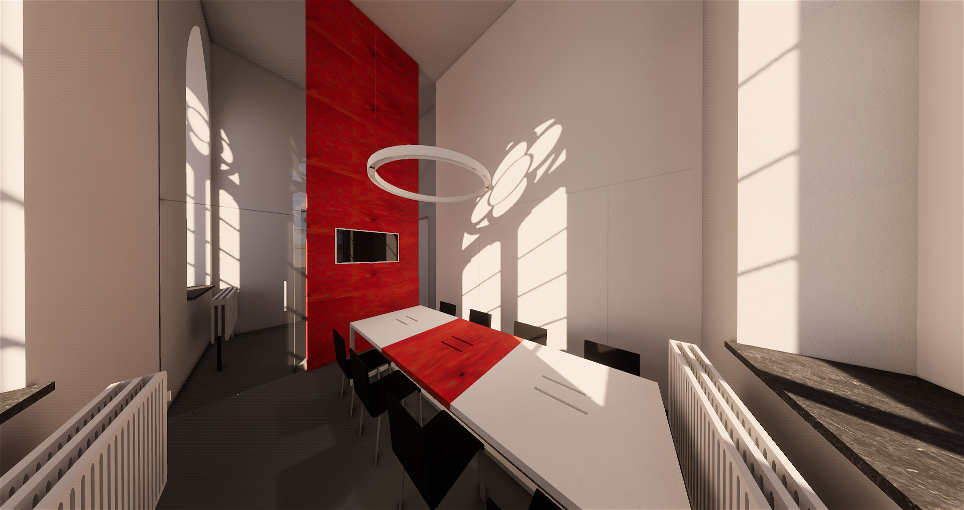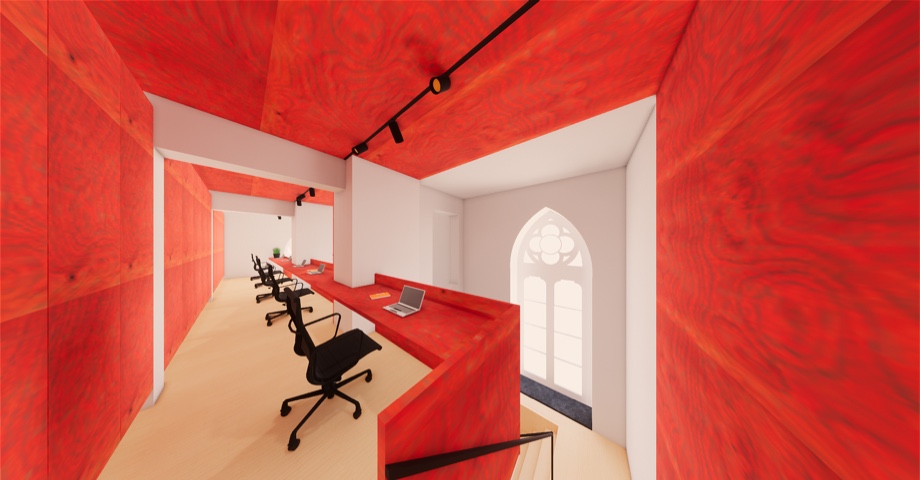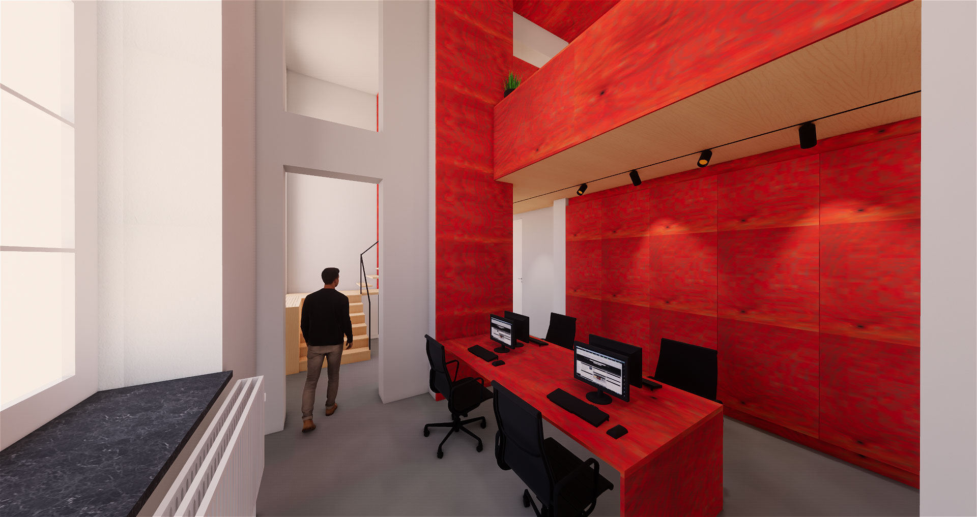In dit ontwerp heb ik gebruik gemaakt van rode gebeitst hout dat door middel van bepaalde lichtelement een 3D effect creƫert in de ruimte. De werkplaatsen zijn zo geplaatst, zodat iedereen naar buiten kan kijken en voldoende zonlicht krijgt. De vergaderruimte daarentegen werd aan de andere kant geplaatst zodat deze de werkplaatsen niet stoort.